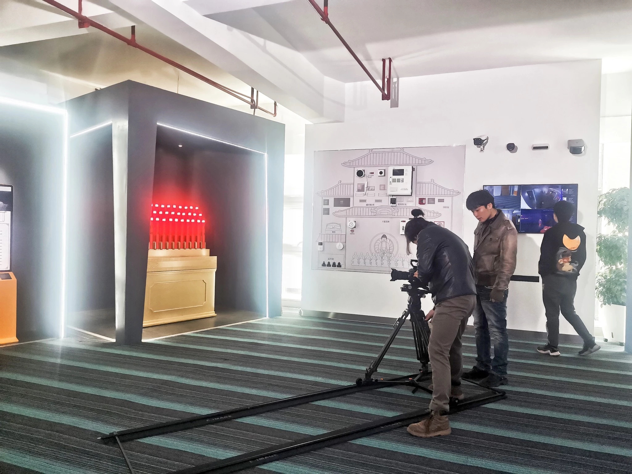 金蛹科技的展廳開始拍攝,攝影組不斷調整燈光、拍攝角度、虛實轉換、細節特寫,全方位多維度錄制智能產品展廳。