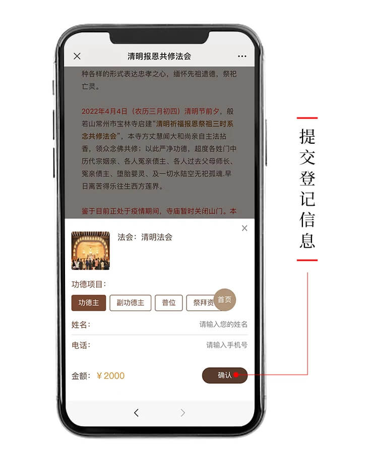 (4)點擊“全年法會”,例如您想?yún)⒓印扒迕鞣〞?,便可點擊“參與登記”,選擇功德項目后登記姓名、電話等信息,按“確認(rèn)”按鈕提交登記信息即可。
