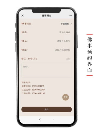 (5)例如您想【佛事預(yù)定】,點擊【寺院微站】首頁的【佛事預(yù)定】按鈕,進入佛事預(yù)定界面,選擇佛事類型、填寫姓名、電話、地址,確認(rèn)信息無誤后按“提交”按鈕即可。