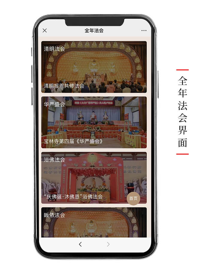 (3)首頁包含“全年法會”、“佛事預(yù)定”、“建寺功德”、“日行一善”、“鮮花供佛”、“供燈禮佛”、“助經(jīng)經(jīng)書”、“放生法會”等板塊。
