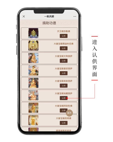 (6)例如您想“鮮花供佛”,點擊 “鮮花供佛”按鈕進入鮮花供佛頁面,選擇您心儀的選項點擊進入界面進行登記,例如選擇“一帆風(fēng)順”,點擊按鈕后進入認(rèn)供界面,進行選擇認(rèn)供。